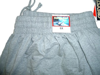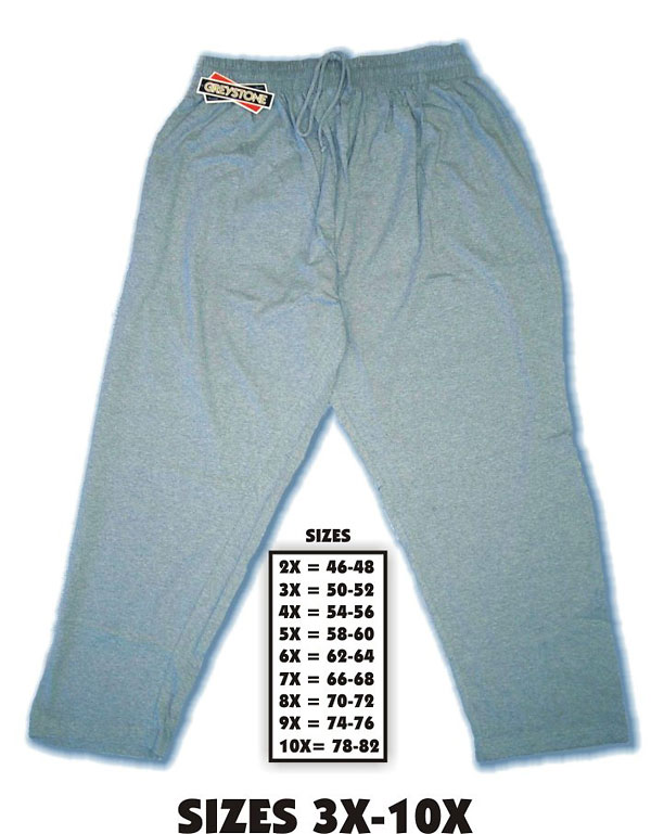 * Greystone Style #1205* 100% cotton jersey knit pant* Two front pockets, one back patch pocket* Matching drawstring from inside of 2 1/4" wide waistband* Longer rise in bigger sizes* Colors: Black, Navy, Grey, Khaki* Sizes: 3X - 10X* Prices start at $23.00 - upcharges for larger sizes